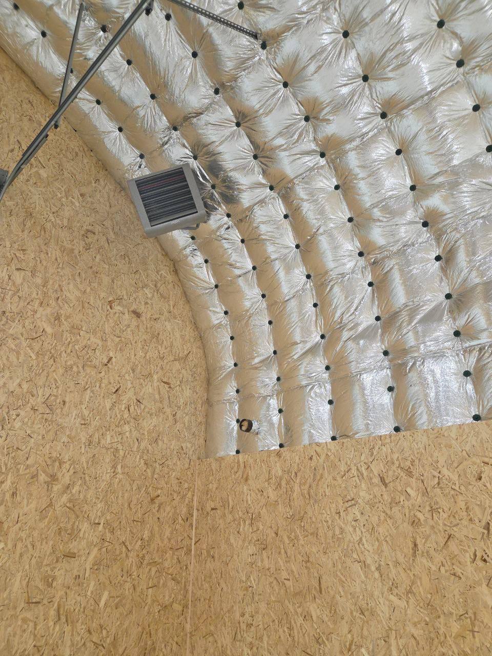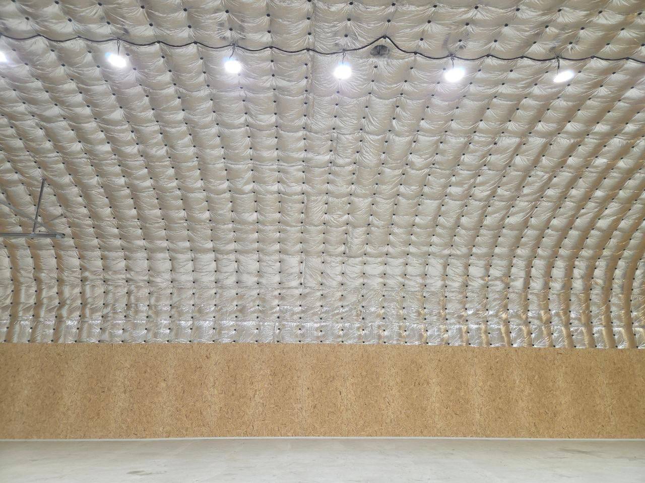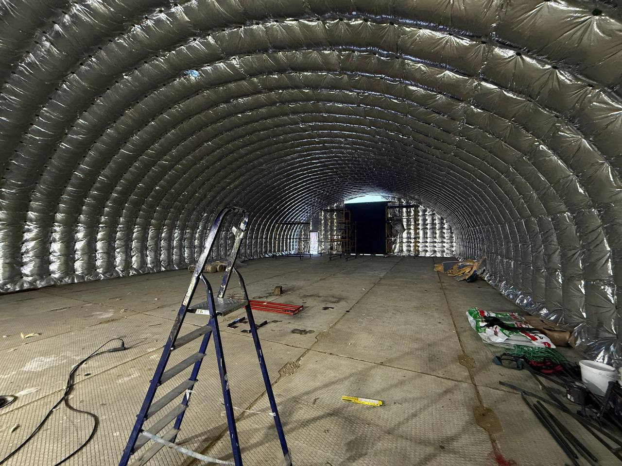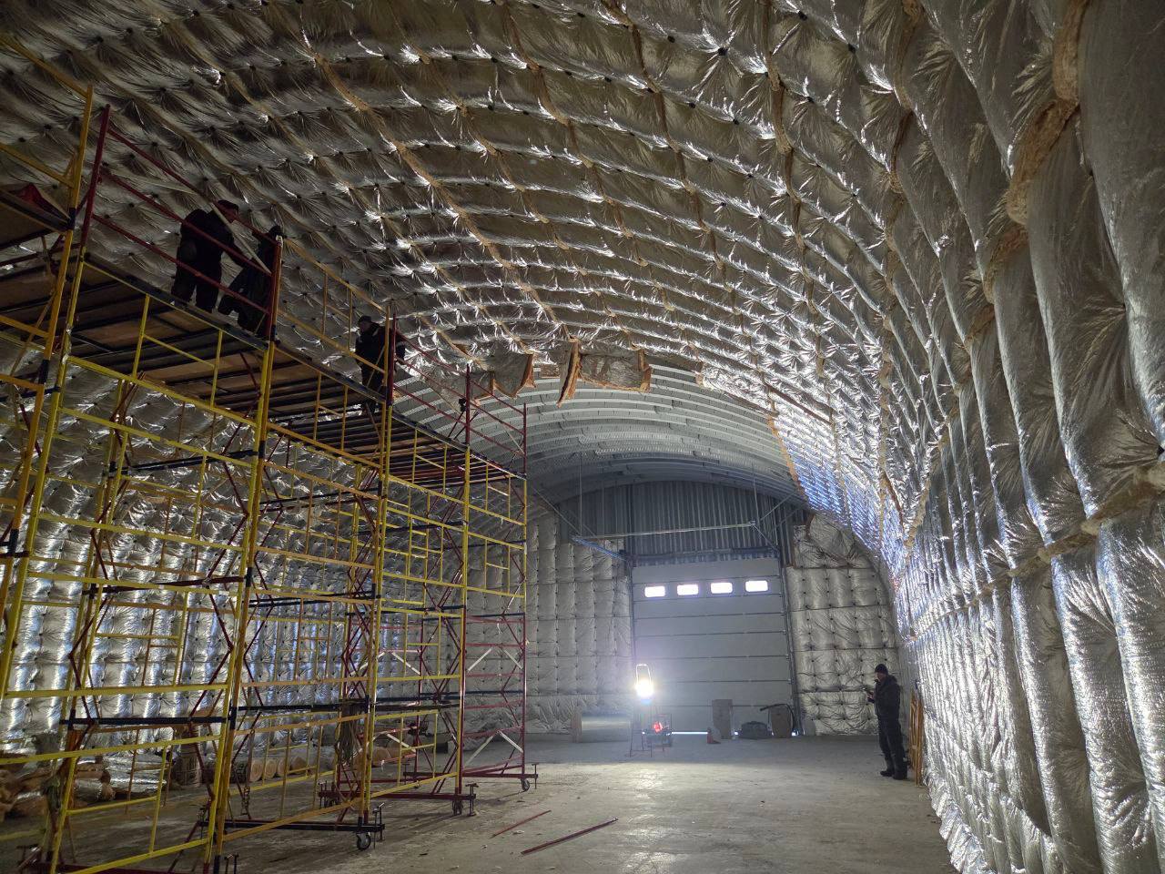 Комплекс работ: Геодезическое сопровождение, планировка основания и устройство ленточного фундамента, сборка ангара, устройство дополнительного проема для ворот сбоку, монтаж оконных проемов, монтаж подъемных ворот и установка турбодефлетора вытяжного, монтаж профлиста внутри ангара, укрытие фольгированного слоя утеплителя тканевым навесом, установка подвесов под светильники освещения. Дополнительное усиление оконных проемов.