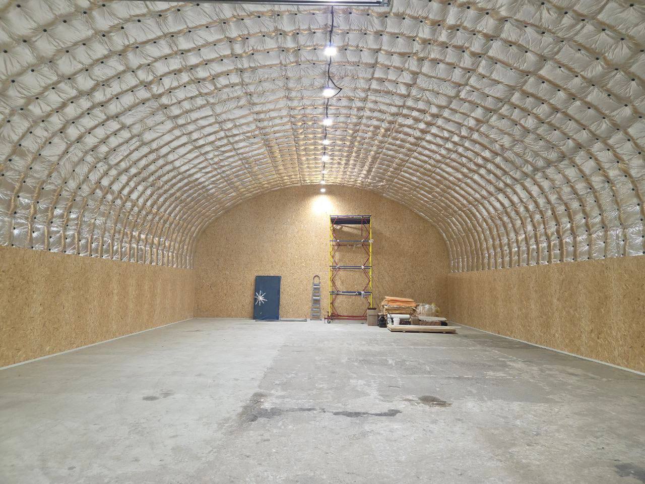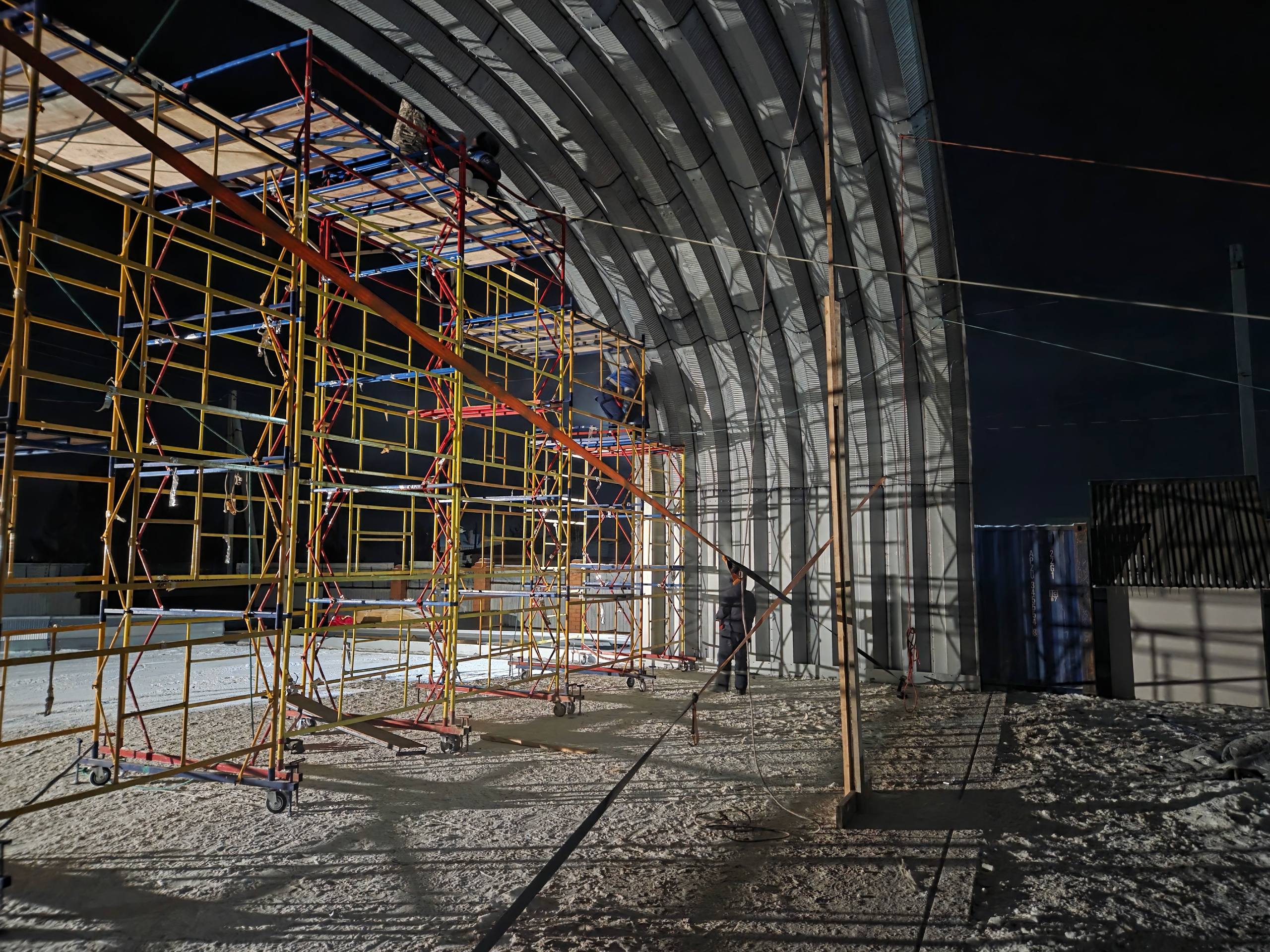 Комплекс работ: геодезическая съемка, устройство монолитной плиты с функцией теплого пола, устройство подвала - тех. помещения, монтаж ангара, монтаж утеплителя, устройство защиты фанерой на высоту 2 м., установка турбодефлектора, установка оконных блоков, установка подъемных утепленных ворот и двери.