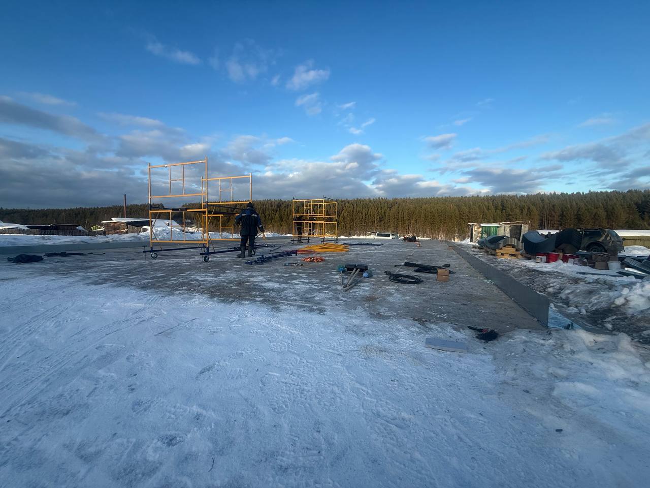 Комплекс работ: монтаж ангара с усиленным утеплением (200мм) на фундамент из плит ПАГ, укрепление фанерой по периметру для защиты от повреждения утеплителя, монтаж подъемных ворот с электроприводом приводом h4,5*4,2. Дополнительный монтаж боковой двери и окраска ангара в сочетание серого и графита. При наступлении плюсовой температуры плановый выезд бригады на монтаж оконных проемов и повторная установка двери боковой (монтаж при сильно отрицательных температурах, гарантийное обслуживание не схватившейся монтажной пены). Монтаж комплекта освещения и систем обогрева volcano VR3, монтаж вводных гильз для подключения систем отопления. Монтаж ротационных турбодефлекторов.