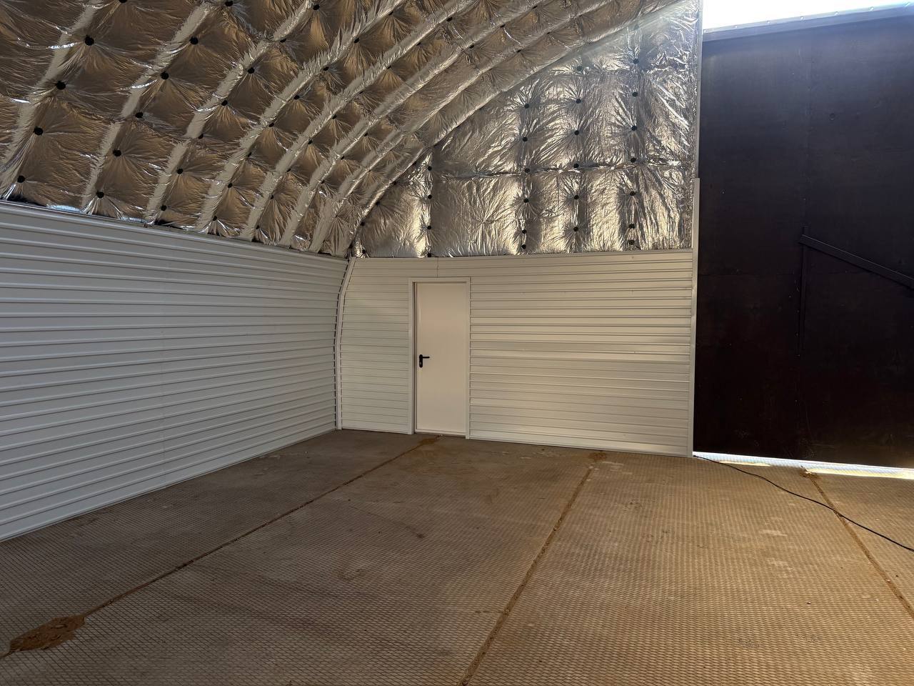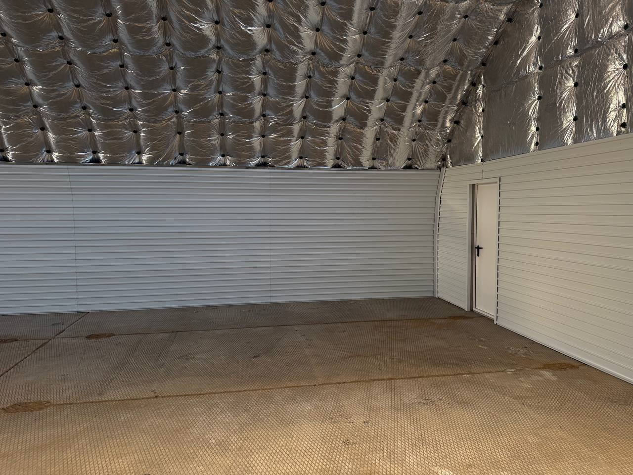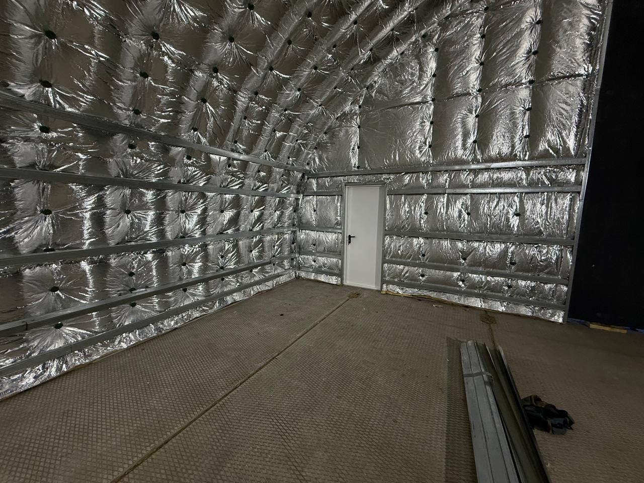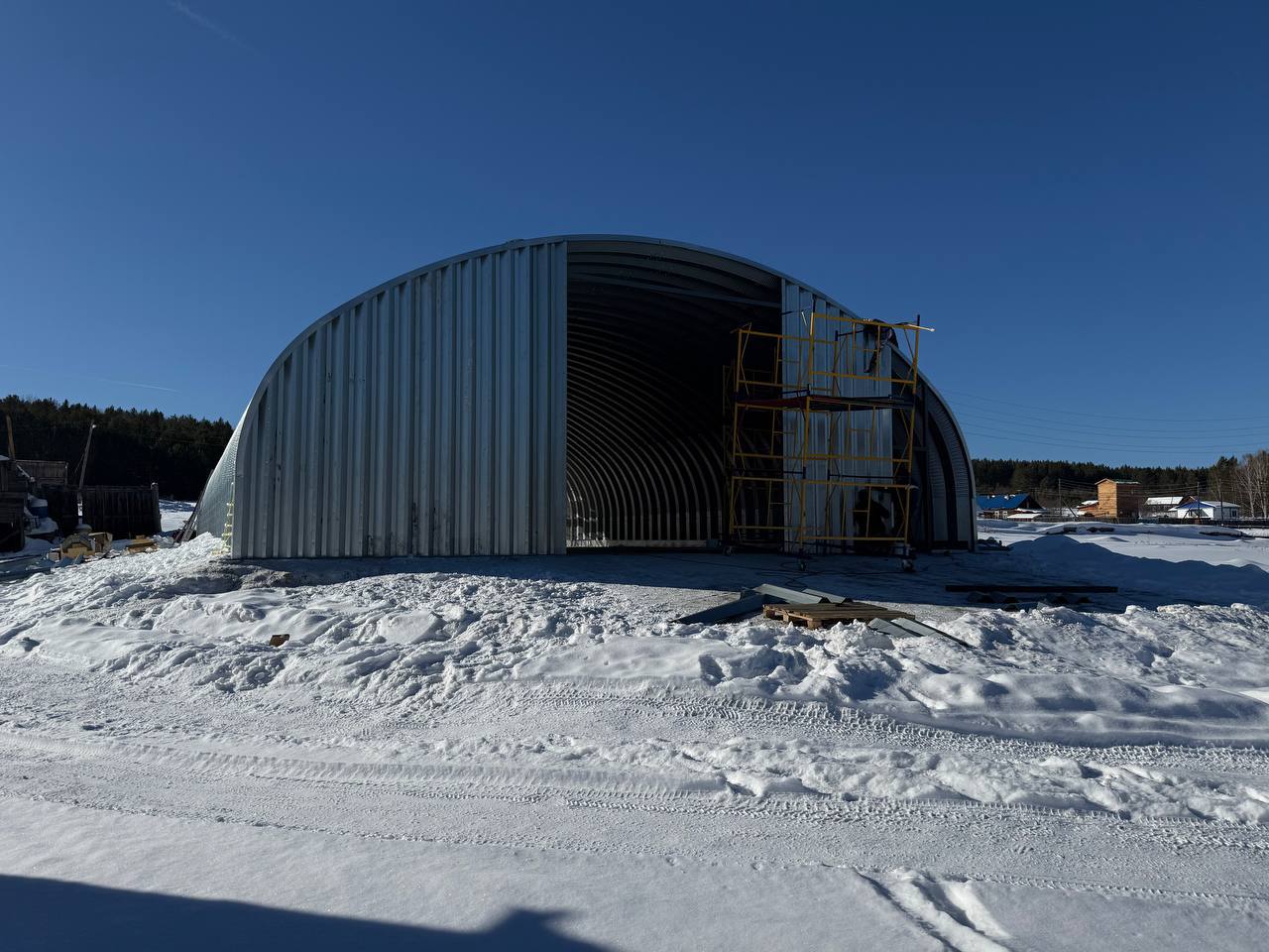Комплекс работ: геодезическое сопровождение с 0 цикла, планировка основания, устройство фундаментной плиты с водяным отоплением, порошковая покраска конструкции, монтаж ангара с утеплением, защита рабочей зоны от повреждения утеплителя на высоту 2.5 метра по длинным сторонам и полное закрытие торцевых стен панелями OSB 12 мм, монтаж подъемных ворот с эл. приводом, установка оконных блоков; монтаж систем освещения. Дополнительно в углу изготовлена комната для с/у и душевой кабины. Монтаж систем видео наблюдения, автоматического освещения с датчиками движения.